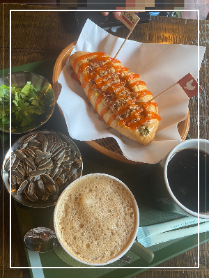 . 저희는 반미치킨샌드위치를 주문했습니다. 친절한 직원님이 샌드위치안에 고수가 들어간다고 하셔서 저는 고수를 좋아하지만 일행은 못 먹을 수 있어서 따로 빼달라고 하니 고스는 이렇게 따로 빼주셨습니다. 고수 옆에 있는 스낵은 해바라기씨입니다. 제가 해바라기씨랑 호박씨랑 헷갈린 것 같습니다. 고수잎은 어린잎이었습니다. 야들하니 맛있었습니다. 고수랑 같이 먹는 샌드위치도 정말 별미였습니다. 예전에 일하던 곳에 베트남 대학생이 있었는데 그 친구가 그러는데 베트남인이라고 해서 다 고수를 먹을 수 있고 좋아하는 것은 아니라고 합니다. 조금 이해는 안 되었지만 사람은 다양하니깐 그럴 수 있다고 생각했습니다. 저는 고구는 쌀국에만 넣어 먹는 것인 줄 알았는데 저렇게 샌드위치에도 넣어 먹다니 뭔가 새로웠습니다. 고수가 남아서 어린 고수를 커피에다 넣어 봤는데요. 커피 역시 맛있었습니다. 끝맛이 고수향이 나는 게 너무 맛있었답니다. 다음에 또 가게 되면 반미샌드위치 소고기나 돼지고기로 먹어보고 싶습니다. 혼자 가기에도 조호은 분위기입니다. 테이블마다 꽃병이 있어서 혼자 가기에도 좋은 곳입니다. 단체모임도 가능한 공간이 있습니다.